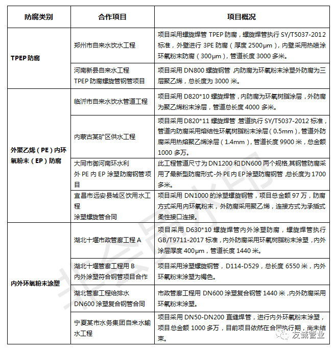 滄州友誠在水,燃?xì)夤こ�,防雷工程領(lǐng)域,工程建設(shè)大量防腐管道供應(yīng)業(yè)務(wù),積累了豐富的工程應(yīng)用技術(shù)經(jīng)驗(yàn),我們可以提供非常貼心的設(shè)計咨詢的客戶。以上是近年來的一些合作案例..