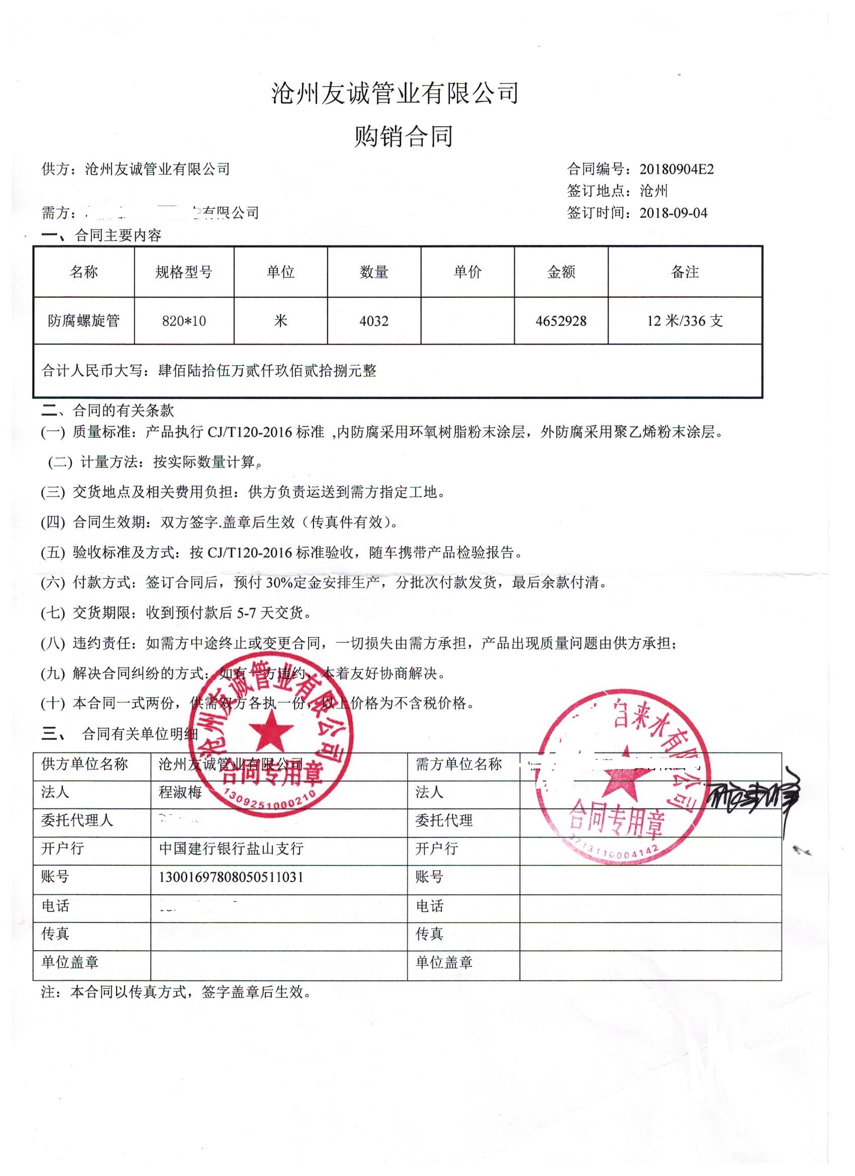 該項(xiàng)目為自來(lái)水涂塑鋼管采購(gòu)項(xiàng)目。 項(xiàng)目隸屬于臨沂市某自來(lái)水公司,選用螺旋鋼管規(guī)格為820*10,12米/支,整個(gè)工程管道用量為4032米,共336支。項(xiàng)目總金額465萬(wàn)。