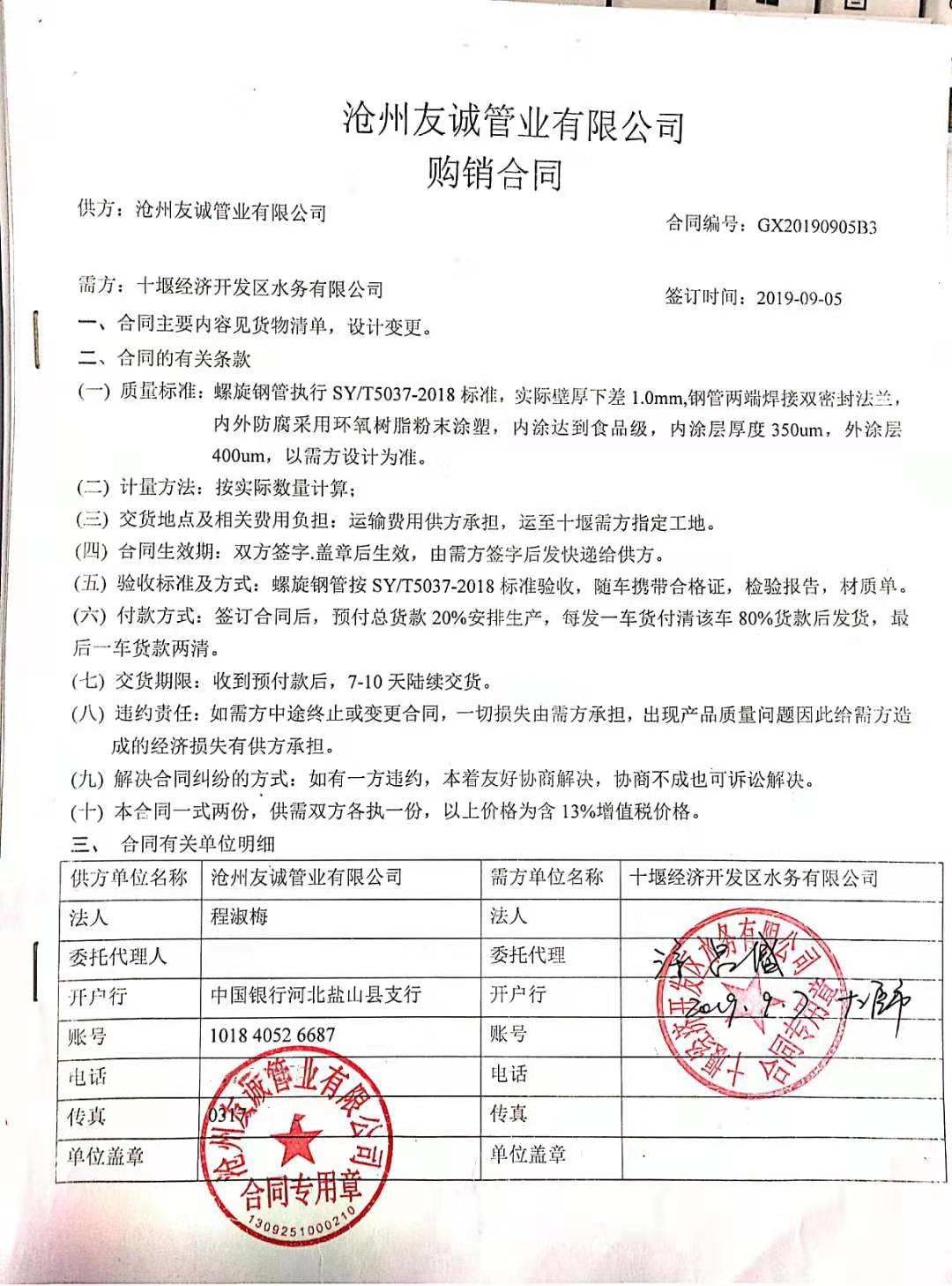 2019年9月友誠(chéng)管業(yè)與十堰經(jīng)濟(jì)開(kāi)發(fā)區(qū)水務(wù)有限公司簽訂十堰經(jīng)濟(jì)開(kāi)發(fā)區(qū)空港產(chǎn)業(yè)園供水管網(wǎng)工程(小康大道)雙密封法蘭涂塑復(fù)合鋼管購(gòu)銷(xiāo)合同,源于客戶(hù)對(duì)我們友誠(chéng)管業(yè)的信任,我們也感恩所有客戶(hù)的支持與信任!