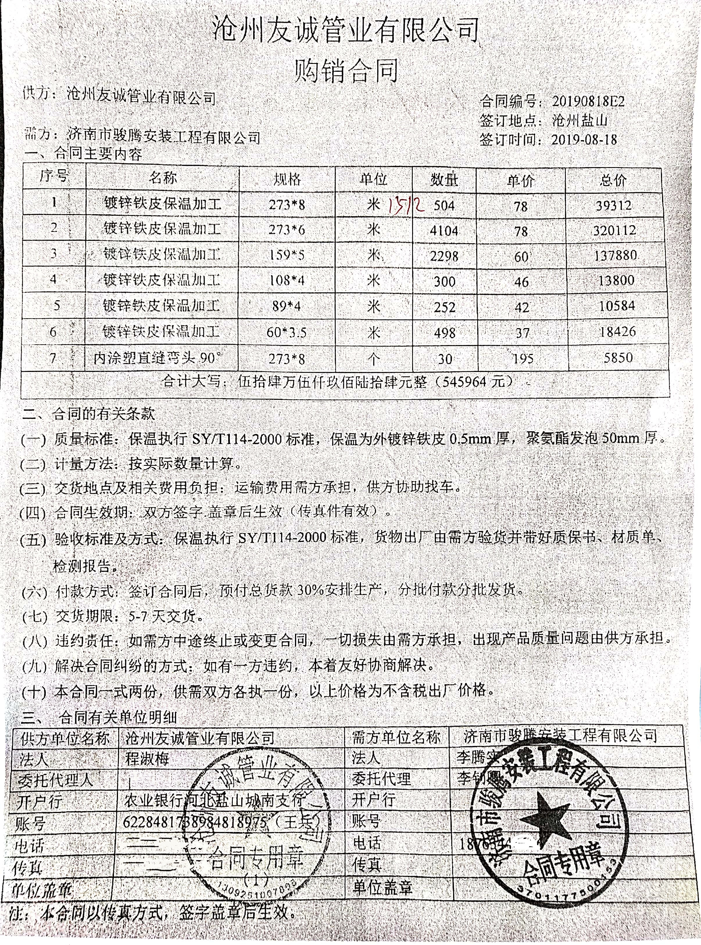 2019年8月友誠(chéng)管業(yè)與濟(jì)南駿騰安裝工程有限公司簽訂(萊蕪鋼鐵集團(tuán)有限公司自來(lái)水改造項(xiàng)目)DN250管道5100米,DN200,DN100管道及配套管件。